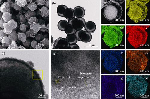 Transition metal vanadates, as an advantageous anode material for lithium-ion batteries, currently have bottlenecks such as unsatisfied conductivity and cycle stability caused by drastic volume changes during charging and discharging. In this study, NiCo2V2O8@TiO2@NC material with a multi-level composite core-shell structure was prepared using a step-by-step coating strategy to improve this defect. Initially, yolk-shell structured NiCo2V2O8 nanospheres were synthesized as the precursor through hydrothermal synthesis and ion exchange methods. Subsequently, a robust TiO2 layer and a nitrogen-doped carbon (NC) network structure were coated on the surface, resulting in formation of a hierarchical mesoporous nanostructure. The specific yolk-shell nanosphere structure provides abundant channels for Li+ transport in NiCo2V2O8, a promising electrochemical active material. Further coating with a TiO2 layer not only enhances the stability and durability of the material, but also offers additional electrochemical active sites. Moreover, introduction of the nitrogen-doped carbon network structure not only improves conductivity of the ordered multi-level core-shell NiCo2V2O8@TiO2@NC material but also facilitates rapid electron transport, further optimizing its electrochemical performance. When lithium-ion battery anode materials were prepared under optimal conditions, the obtained cell exhibited an initial specific capacity of 1422.0 mAh∙g-1, which remained 1011.9 mAh∙g-1 after 500 cycles, corresponding to a specific capacity retention rate of 71.2%. This material demonstrates high specific capacity, good rate performance, and excellent cycle stability, displaying promising prospective for a wide range of applications in energy storage devices.