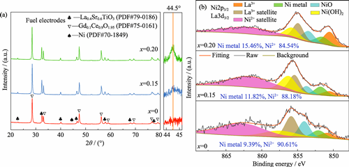 Interface engineering is an effective strategy to develop fuel electrode materials with excellent catalytic activity of CO2 for solid oxide electrolysis cell. In this study, La0.3Sr0.6Ti1-xNixO3-δ/Ce0.9Gd0.1O2-δ (LSTNx/GDC) composite fibers were directly prepared by electrospinning technology, by which novel fiber-based fuel electrodes were constructed with LSTNx as electronic channel skeleton, GDC as embedded ion channel and in-situ Ni as exsolution nanoparticles. Effect of B-site Ni-doping on the morphology, structure and CO2 catalytic activity of the fiber-based fuel electrode was studied. The results of SEM observation reveal that the LSTNx/GDC composite fibers with uniform diameter (100-150 nm) and without obvious particle agglomeration or fracture gap are successfully prepared when the Ni-doping coefficient (x) is 0.15 or 0.20. More in-situ B-site nickel nanoparticles (sizes between 20 and 30 nm) could be exsolved from the prepared fuel electrode under reducing atmosphere. The relaxation time distribution analysis confirms that in-situ exsolution of B-site nickel metal nanoparticles can not only provide more active sites, but also form rich heterointerfaces with composite fiber, accelerating the interfacial charge transfer, significantly increasing the adsorption and enhancing the catalytic ability of CO2. Electrolytic current density of the single cell (with the doping coefficient of 0.20 at 850 ℃, CO2 : H2 at 5 : 5 (in volume) under 1.5 V) increases to 0.799 A·cm-2 while polarization impedance decreases to 0.171 Ω·cm², presenting excellent stability without significant current fluctuation up to 70 h.