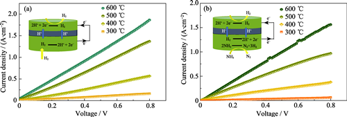 Ammonia (NH3) has been considered as a hydrogen storage material due to high hydrogen storage density and ease of liquefaction, thus hydrogen (H2) production by ammonia decomposition is an ideal method for hydrogen preparation. However, traditional ammonia decomposition technologies face challenges such as high operating temperatures, low efficiency at moderate temperatures, and difficulties in hydrogen purification. In this study, proton ceramic membrane reactor (PCMR) with symmetric structure of porous electrode Ni-BZCY/BZCY/Ni-BZCY (BZCY: BaZr0.1Ce0.7Y0.2O3-δ) was prepared by co-pressing method. At 600 ℃, PCMR exhibited polarization resistances (Rp) of 0.11 and 0.23 Ω·cm2 in H2 and NH3 atmospheres, respectively, with corresponding current densities of 1.87 and 1.56 A·cm-2 at an applied voltage of 0.8 V. Even at 300 ℃ and 0.8 V, the current densities in H2 and NH3 remained at 0.16 and 0.06 A·cm-2, respectively. The NH3 conversion efficiency of PCMR reached 80% at 600 ℃, improving by 8% compared to bare catalyst material. Even at 350 ℃, an additional improvement of 0.3% can still be attained, and the NH3 conversion efficiency of about 1% was demonstrated even at 300 ℃. This study provides a novel approach to low-temperature ammonia decomposition for hydrogen production.