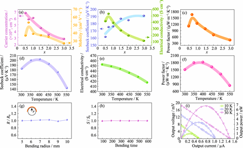 Bismuth telluride-based materials have been extensively studied due to their outstanding thermoelectric performance at room temperature. However, bismuth telluride is inherently brittle, which poses a significant challenge in developing flexible bismuth telluride-based materials with high thermoelectric performance remains in thermoelectric research. In this study, a non(00l) layered flexible p-type thermoelectric thin film was fabricated by depositing Cu0.005Bi0.5Sb1.495Te3 onto polyimide (PI) substrates using magnetron sputtering technology, with a systematic investigation of the effect of sputtering pressure on thermoelectric properties. The results show that at 0.7 Pa sputtering pressure, its mobility is enhanced due to the large grain size and high crystallinity, its carrier concentration is optimized to 5.78×1019 cm−3, and its room-temperature power factor (PF) reaches 1660 μW·m−1·K−2. In addition, the film exhibits excellent mechanical flexibility, showing less than 10% variation in resistivity at a bending radius of 5 mm and less than 5% variation in Seebeck coefficient after 600 cycles of bending. Furthermore, a flexible thermoelectric device comprising four p-type thermoelectric legs (5 mm×25 mm×767 nm) was designed and fabricated based on this film. The device demonstrates promising performance, generating an output voltage of 18.5 mV, with a power density reaching 44.80 μW·cm−2 under a temperature difference of 30 K. Touch-sensitive linguistic output design of the device demonstrates promising potential for language assistance applications. This work provides valuable insights into the magnetron sputtering preparation of high-performance flexible bismuth telluride-based thermoelectric materials and the optimization of their properties.