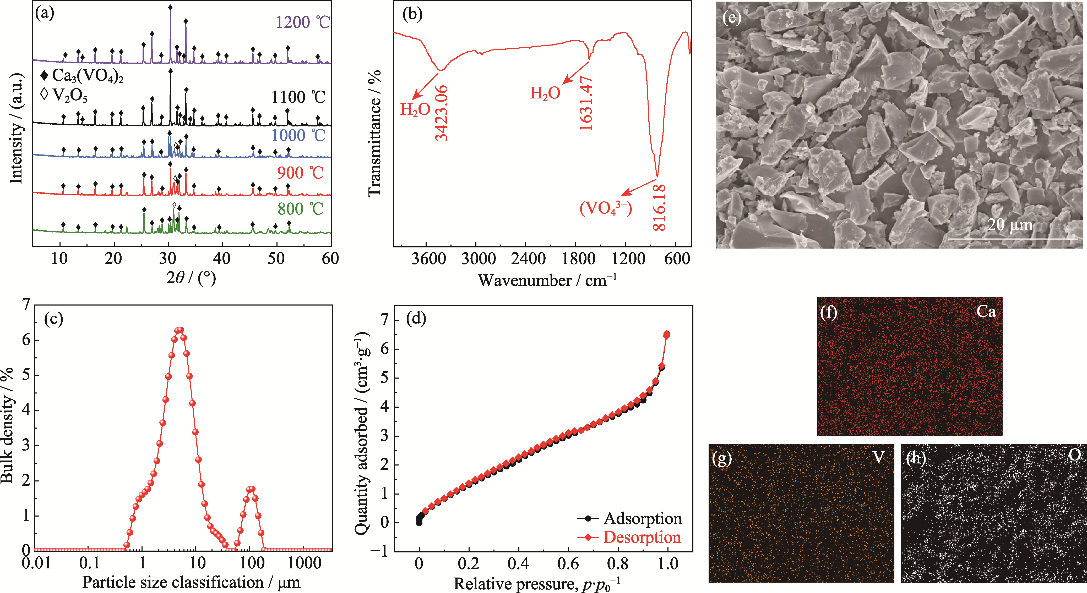Fig. 1 Characterization results of Ca3(VO4)2 powder (a) XRD patterns of Ca3(VO4)2 prepared at different temperatures for 4 h; (b-h) FT-IR spectrum (b), particle size distribution (c), nitrogen adsorption-desorption curves (d), SEM image (e) and EDS mappings (f-h) of Ca3(VO4)2 prepared at 1100 ℃ for 4 h