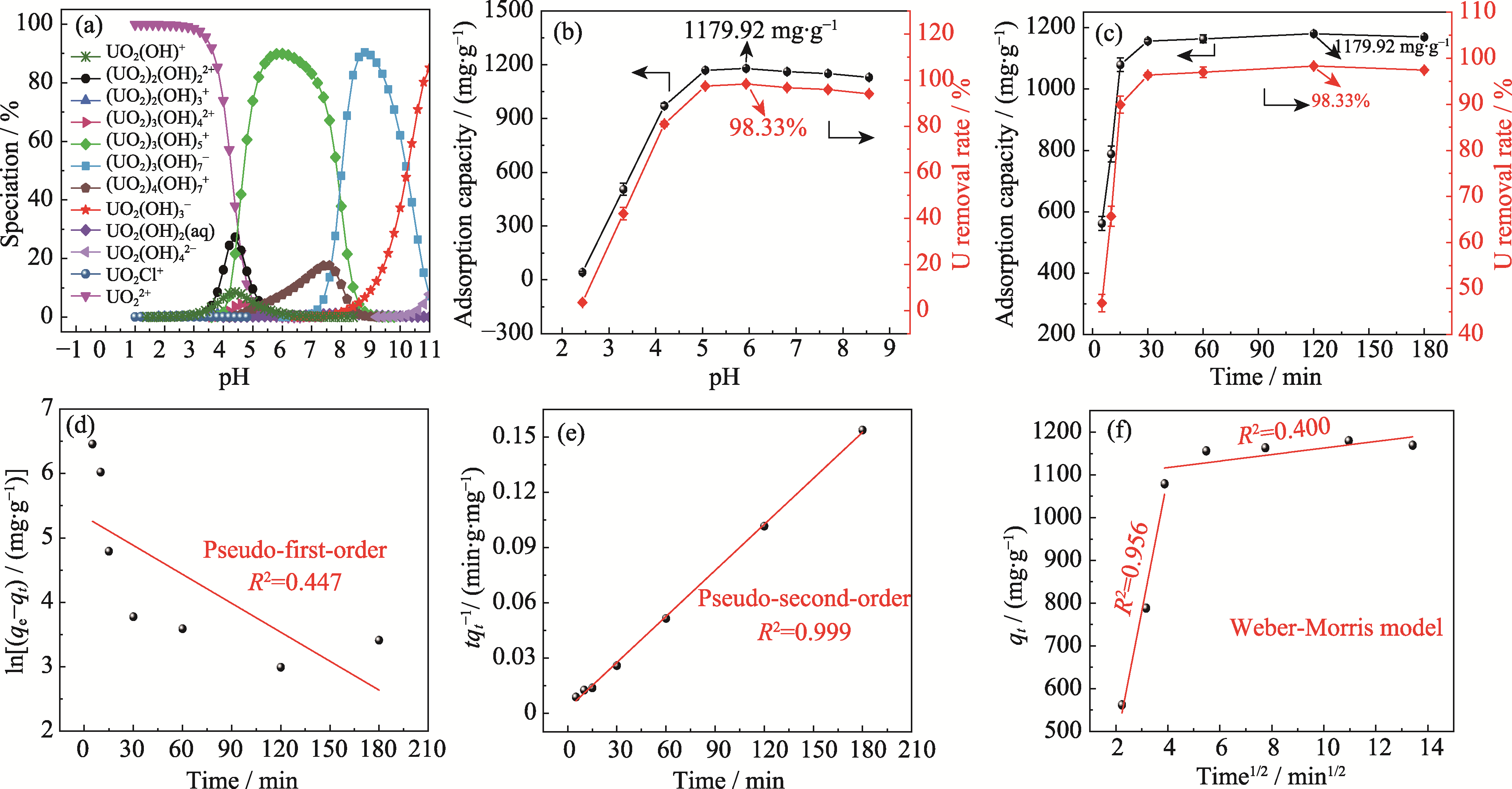 Fig. 2 Effect of pH and adsorption time on removal of U(VI) by Ca3(VO4)2 (a) Species distribution of U(VI) with different pH (U(VI) at mass concentration of 120 mg·L-1 under 308 K); (b, c) Adsorption capacity and removal rate of U(VI) with different pH (b) and durations (c); (d-f) Pseudo-first-order (d), pseudo-second-order (e) and Weber-Morris (f) models fitting (temperature at 308 K, initial U(VI) mass concentration at 120 mg·L-1, adsorbent dosage at 0.1 g·L-1)