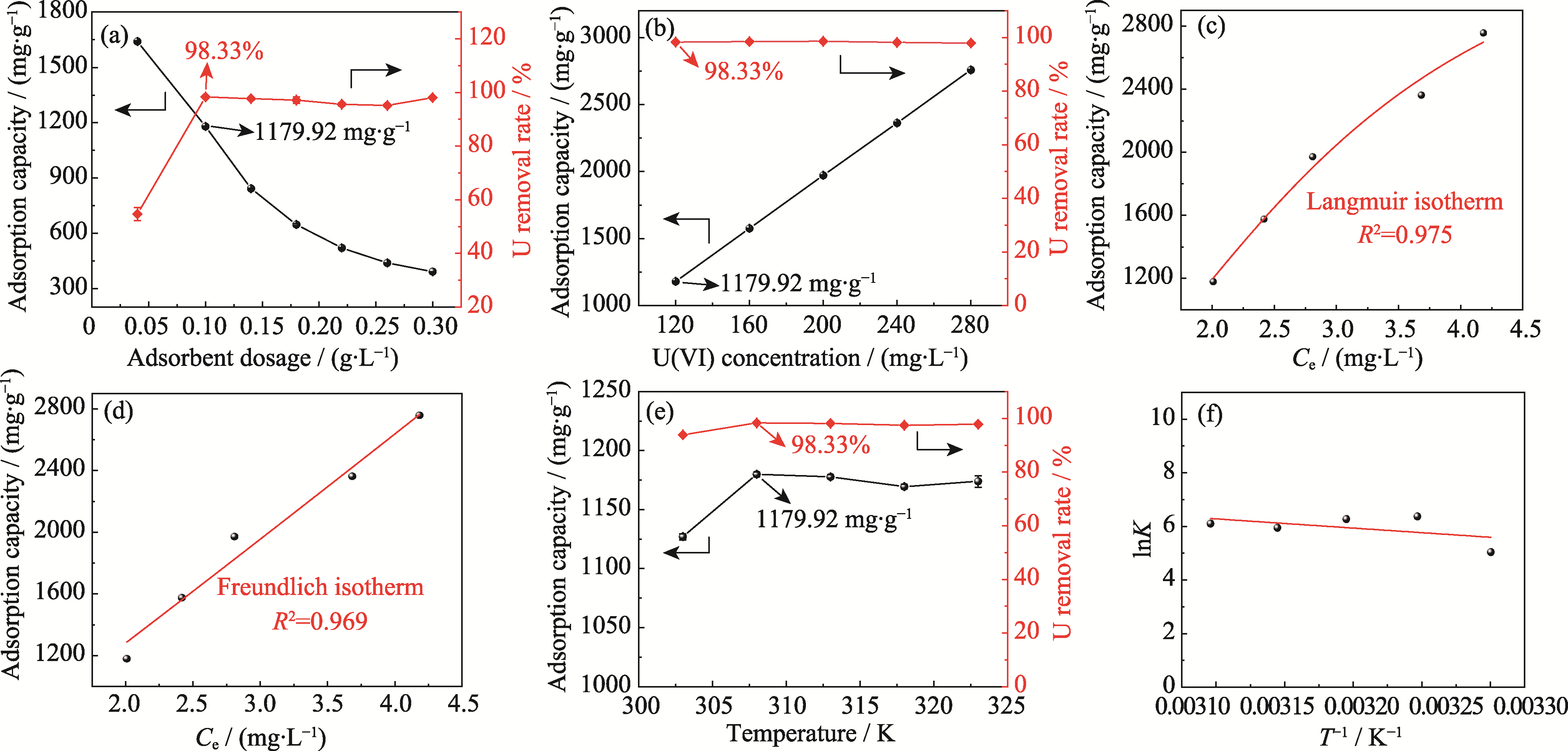 Fig. 3 Effects of adsorbent dosage, initial U(VI) mass concentration, and temperature on removal of U(VI) by Ca3(VO4)2 (a, b) Adsorption capacity and removal rate of U(VI) with different adsorbent dosages (a) and initial U(VI) mass concentrations (b);(c, d) Langmuir (c) and Freundlich (d) isothermal adsorption models fitting; (e) Adsorption capacity and removal rate of U(VI) at different temperatures; (f) Relationship between lnK and 1/T (temperature at 308 K, pH 6, adsorption time at 2 h)