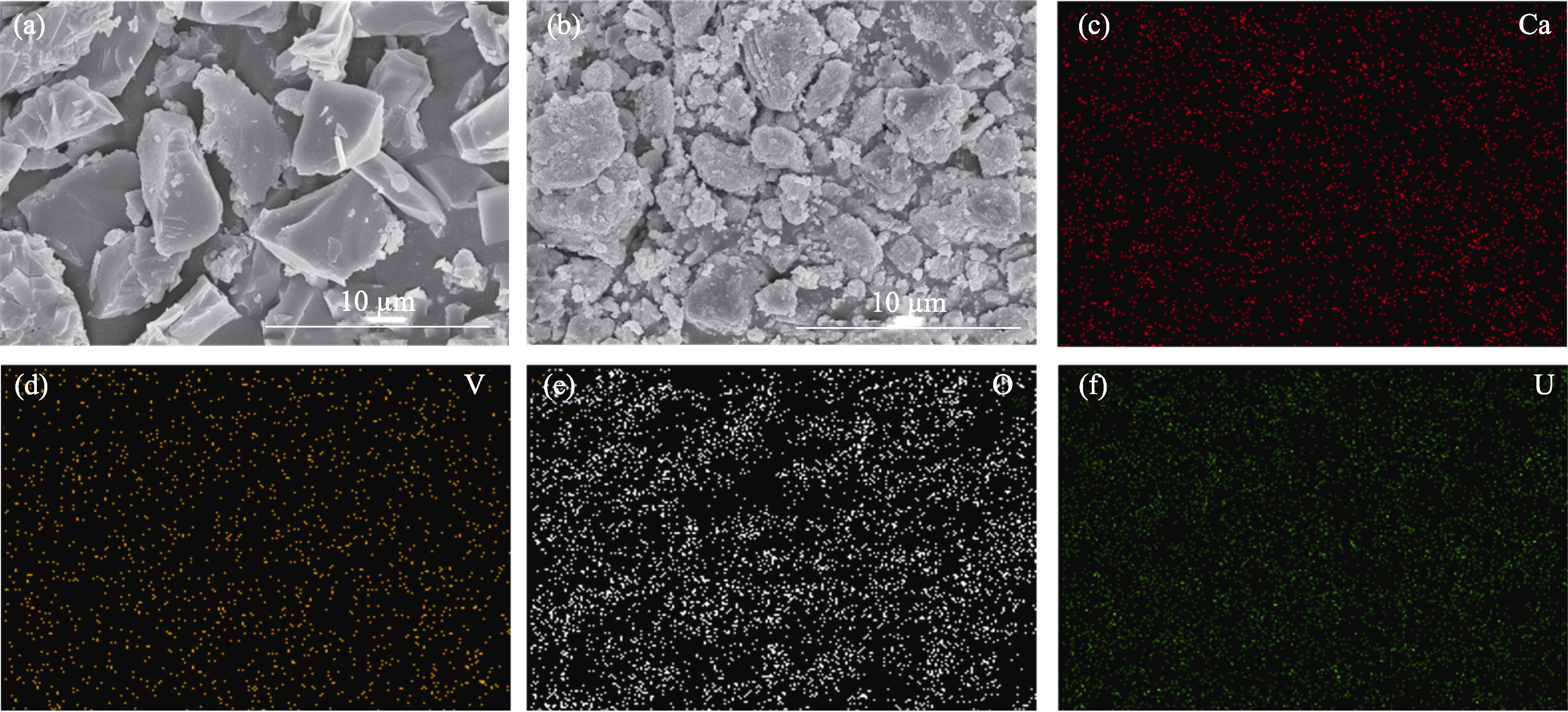 Fig. 4 SEM images and surface element distributions of Ca3(VO4)2 before and after adsorption of U(VI) (a, b) SEM images of Ca3(VO4)2 before (a) and after (b) adsorption of U(VI); (c-f) EDS mappings of Ca3(VO4)2 after adsorption of U(VI)