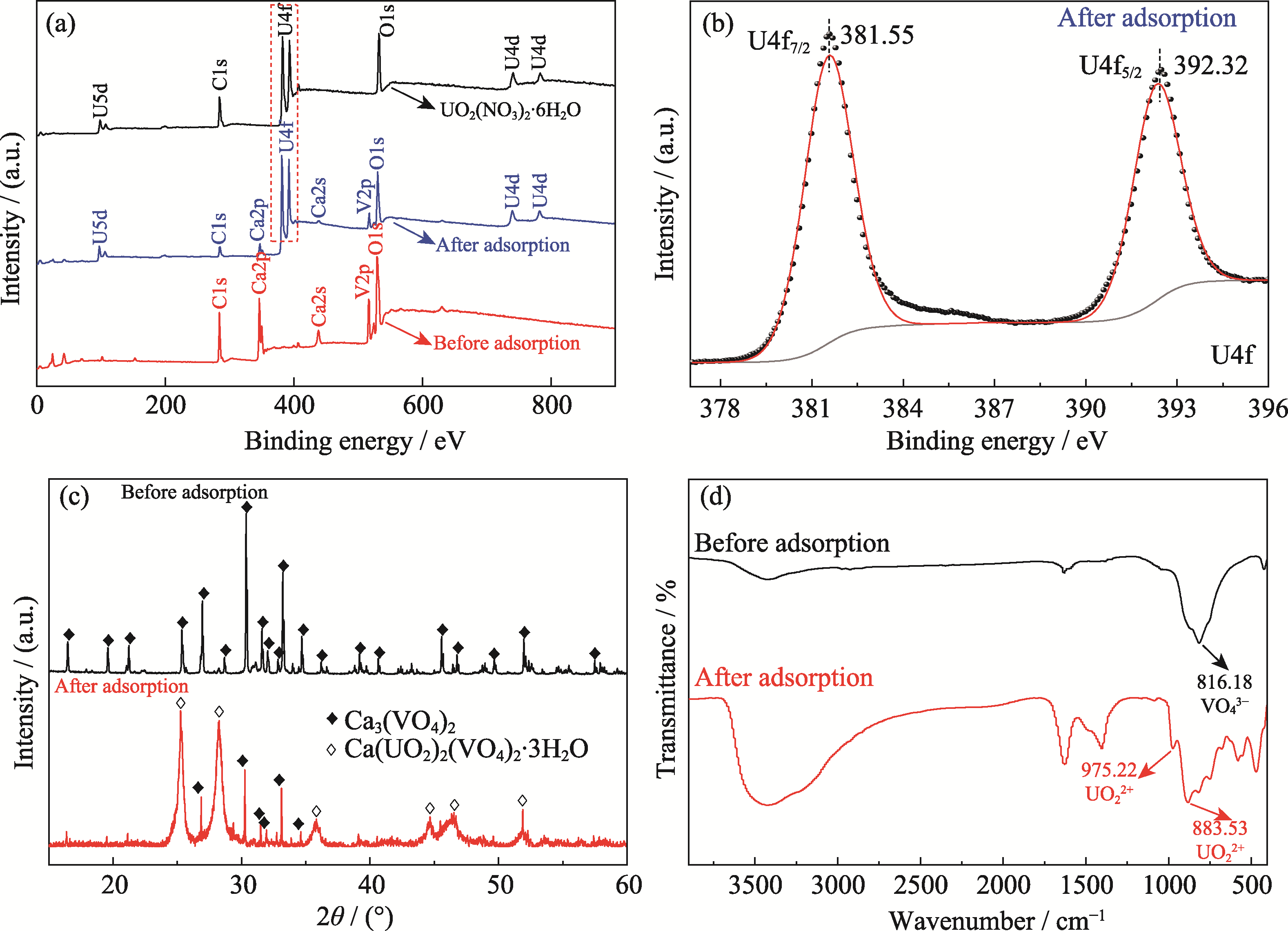 Fig. 5 Characterization results of Ca3(VO4)2 before and after adsorption of U(VI) (a) XPS spectra of Ca3(VO4)2 and UO2(NO3)2·6H2O; (b) U4f XPS spectrum of Ca3(VO4)2 after adsorption of U(VI); (c, d) XRD patterns (c) and FT-IR spectra (d) of Ca3(VO4)2
