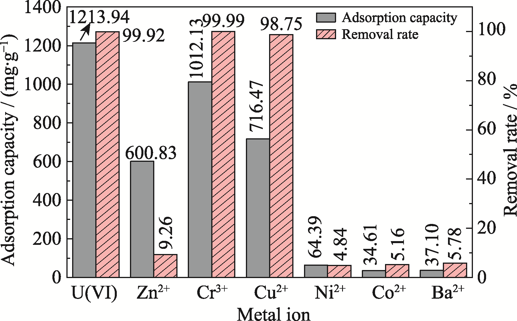 Fig. 6 Adsorption capacity and removal rate of Ca3(VO4)2 for several metal ions in coexisting ionic solution pH 6; Adsorption time: 2 h; Adsorbent dosage: 0.1 g·L-1; Temperature: 308 K