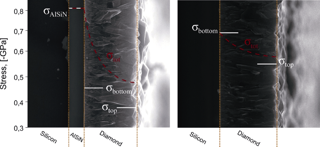 Fig. 6 Distribution of the total stress σtot in the system and the stress σAlSiN in the Al-Si-N intermediate layer, as well as the bottom and top stress (σbottom, σtop) of the diamond film[62]