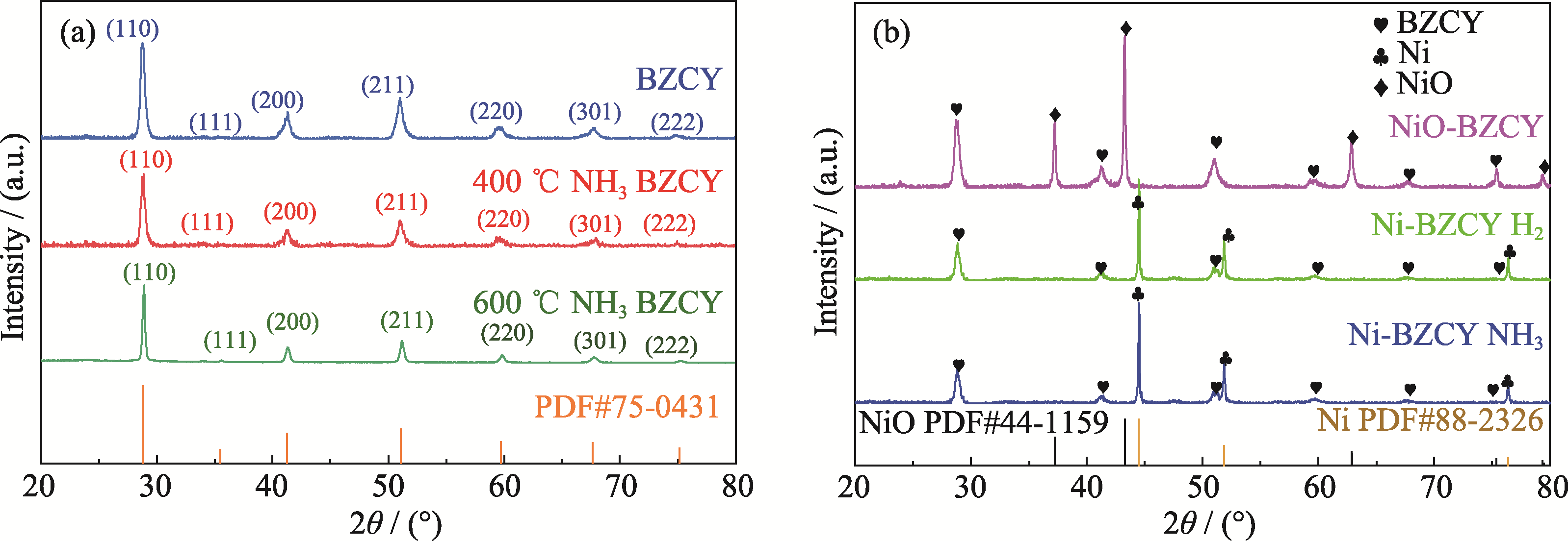 Fig. 2 XRD patterns of samples (a) BZCY calcined at 1000 ℃ for 5 h in air and calcined at 400 and 600 ℃ for 4 h in NH3; (b) NiO-BZCY and Ni-BZCY treated with H2 and NH3 for 4 h at 400 ℃