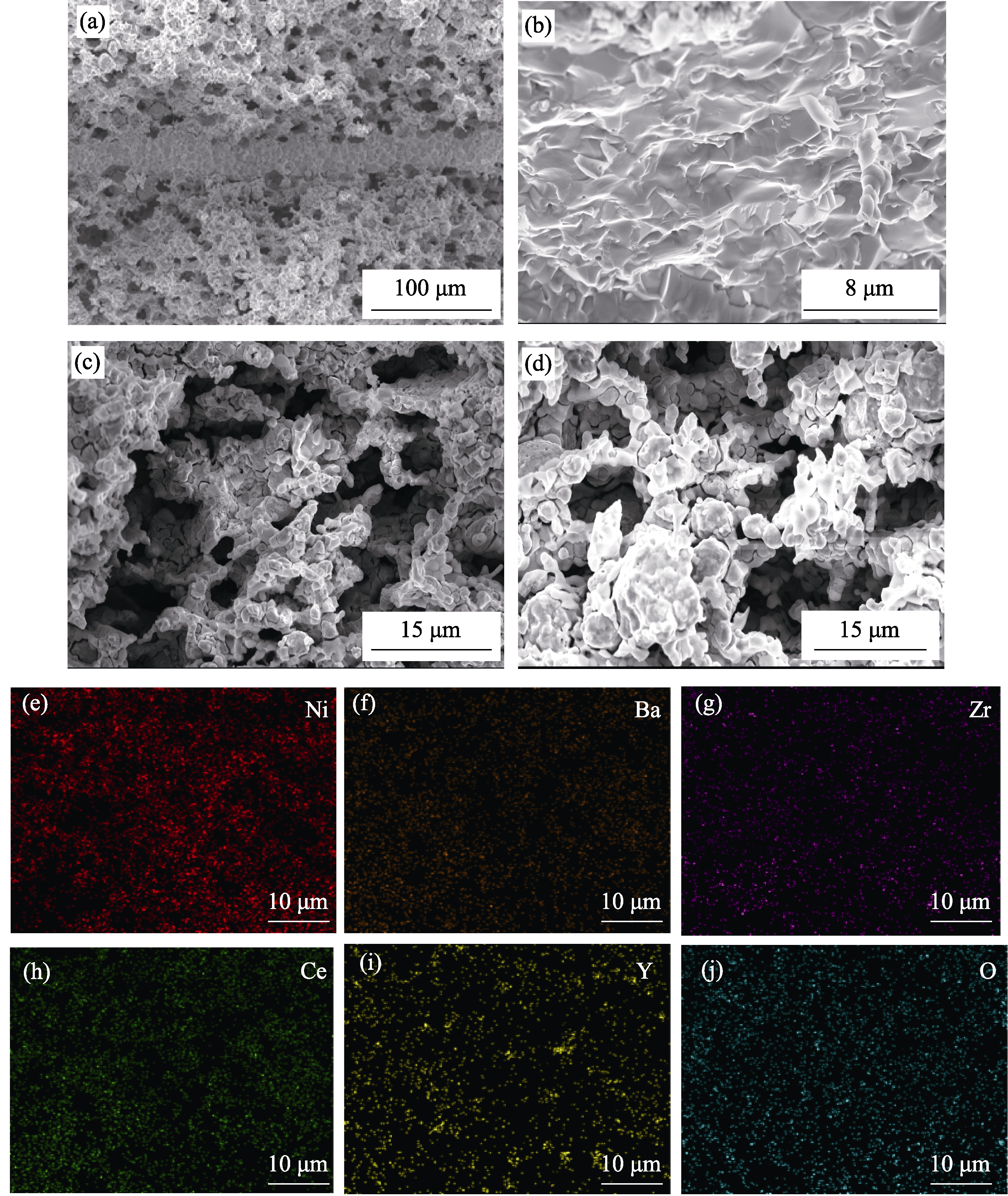 Fig. 3 SEM images of (a) cross-section, (b) electrolyte, and (c, d) electrodes on both sides of PCMR, and (e-j) EDS elemental mappings of NiO-BZCY electrode