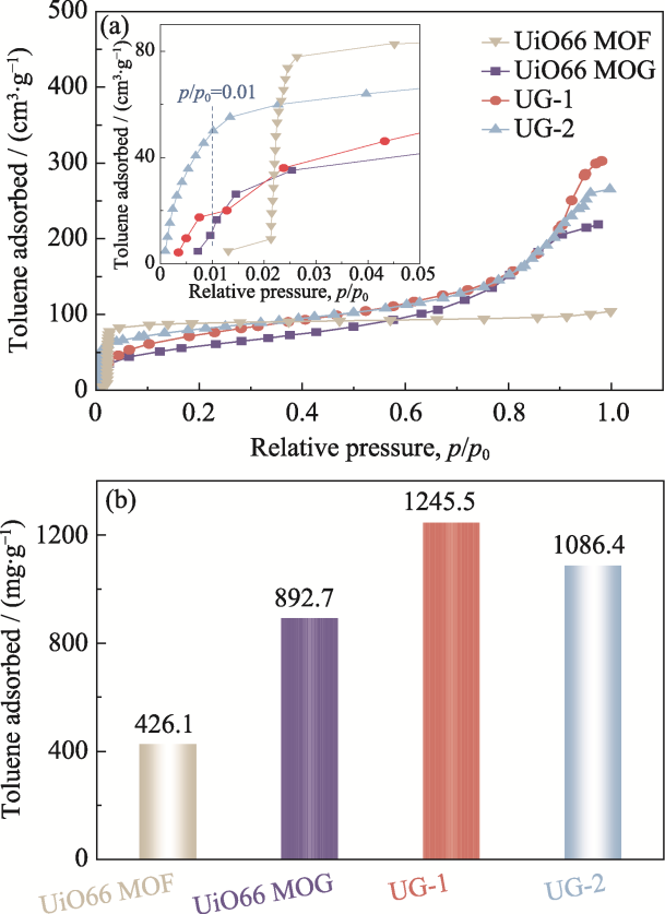 Fig. 4 (a) Toluene vapor adsorption isotherms and (b) saturated toluene adsorption capacities of UiO66 MOF, UiO66 MOG, UG-1, and UG-2 with inset in (a) showing adsorption isotherms in a low-pressure region p/p0=0-0.05