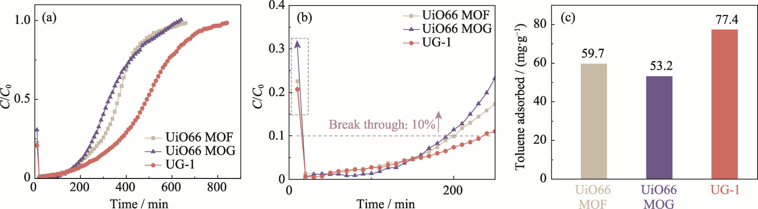 Fig. 5 Dynamic breakthrough curves for toluene adsorption within (a) 800 and (b) 250 min, and (c) equilibrium toluene adsorption capacities of UiO66 MOF, UiO66 MOG and UG-1