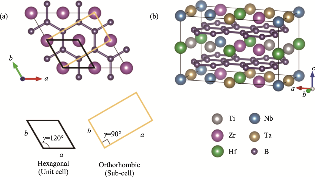 Fig. 1 (a) Schematic illustration of transformation relationship between hexagonal and orthorhombic unit cells; (b) Initial atomic configuration of (Hf0.2Zr0.2Ta0.2Ti0.2Nb0.2)B2