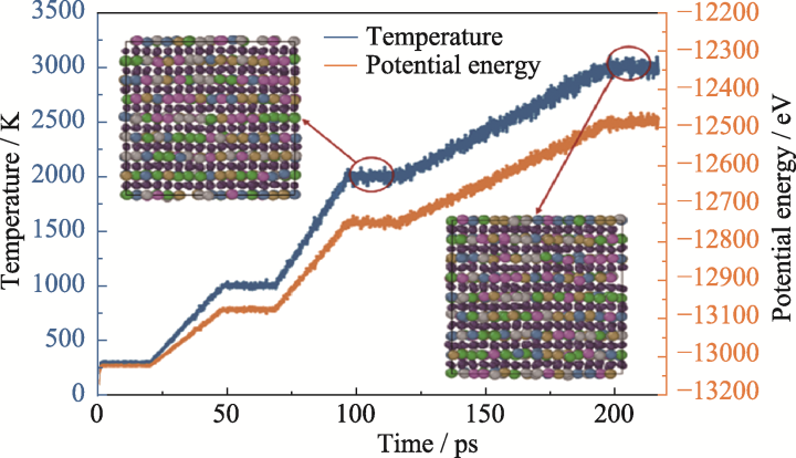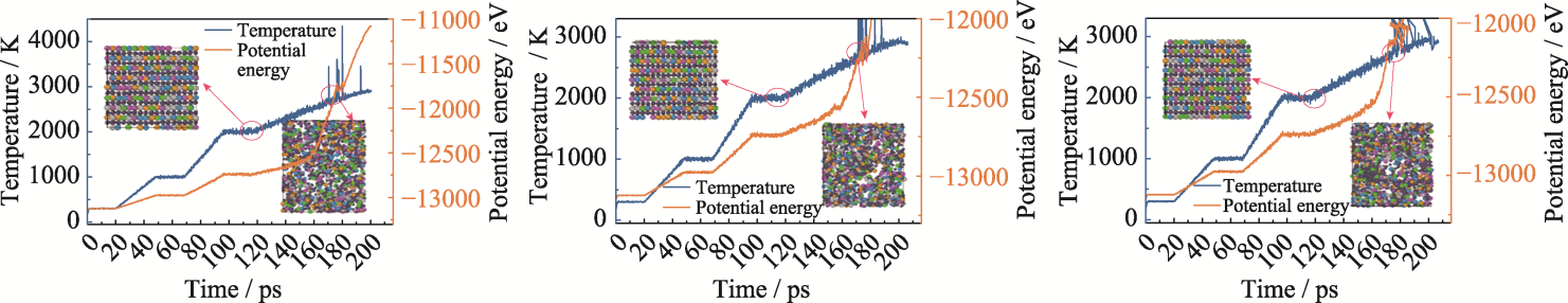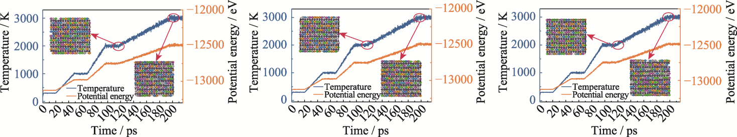 Fig. S1 Evolution of temperature, potential energy and atomic structure over time during the heating process in DP-1 force field under different random initial configuration tests