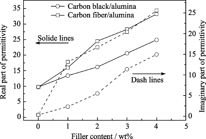 | 图3 不同碳纤维含量的碳纤维/氧化铝涂层的介电常数Fig. 3 Complex permittivity of carbon fiber/alumina coatings with different contents of carbon fiber |