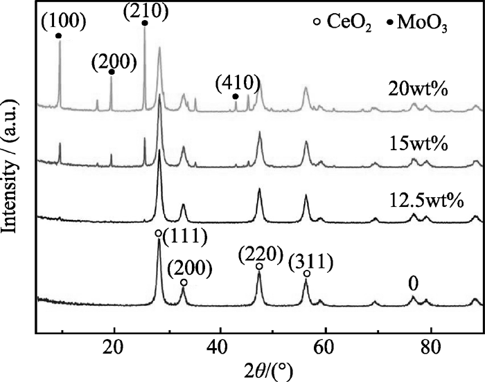 图4为纯CeO2和不同MoO3含量MoO3/ CeO2杂化材料中的XRD图谱. 由图4可知, 纯CeO2的特征衍射峰对应的晶面分别为(111)、(200)、(220)和(311), 为面心立方结构(JCPDS 43-1002). 而MoO3的掺入对CeO2的特征衍射峰的位置及强度影响很小, 说明MoO3的加入没有使CeO2的晶体结构发生变化. 而当MoO3掺入量为15wt%时, 出现了MoO3晶相特征峰, MoO3掺入量继续增加到20wt%时衍射峰的强度明显增强, 当负载量低于分散阈值时, 负载物呈单层或亚层分散而无晶相衍射峰出 现[ 8]. 这说明MoO3掺入量为12.5wt%时MoO3分布在第一层; 增加到15wt%时开始有少量MoO3进入第二层; 继续增加到20wt%时, MoO3有5wt%以上的进入到第二层分布, 即MoO3有明显的晶相衍射峰出现. MoO3特征衍射峰对应的晶面分别为(100)、(200)、(210)、(410), 与六方晶系结构(JCPDS 21-0509)相吻合, 这也说明不需要通过烧结就可以水热合成六方晶系的MoO3.