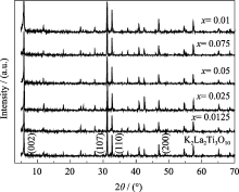 K2La2Ti3- xPb xO10的制备方法与文献[ 14]报道的硬脂酸法合成K2La2Ti3O10的方法类似, 并稍加改进: 称取30 g硬脂酸油浴加热熔融, 称取10 g硝酸镧及适量掺杂离子的盐溶液加适量水溶解, 将硝酸镧溶液加入到熔融的硬脂酸中, 130℃搅拌蒸干水分; 再称取2.5 g氢氧化钾加少量水溶解加入到溶有硝酸镧的硬脂酸中, 搅拌2 h, 加入14.5 g钛酸丁酯搅拌0.5 h, 电炉加热点火燃烧除去有机物, 形成K2La2Ti3O10前驱体研磨待用; 将掺杂离子与Ti摩尔比 x=0.0125、0.025、0.05、0.075的乙酸铅与K2La2Ti3O10前驱体研磨均匀1000℃焙烧2 h, 制备的产物记作K2La2Ti3- xPb xO10.