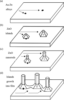 通过上述分析可以发现, 作为催化剂的金膜的初始状态对氧化锌纳米棒的生长有重要影响. 由于衬底和金膜之间具有动态润湿性, 在一定高温下(>850℃时), 连续的金膜会分裂为许多孤立的颗粒[ 20]. 随着衬底温度的升高(850~925℃), 紧邻的颗粒会通过Ostwald熟化机制结合成大的颗粒, 因而, 金颗粒的密度会减小. 所以, 以金颗粒为成核生长点的纳米棒的生长密度也减小, 如图2(a)~(c)所示. 随着温度的进一步升高(950℃时), 纳米线通过VS机制的横向生长使得分离的纳米线出现连接, 如图2(d)所示. 同理, 在相同的衬底温度下(910℃时), 金颗粒在衬底上的密度会随着初始金膜的厚度增大而增大, 所以, 纳米棒生长的密集程度随金膜初始厚度增大而增大, 如图4(b)~(d)所示. 因此, 通过改变衬底温度和金催化剂薄膜厚度, 利用高压PLD可以实现氧化锌纳米棒的可控生长.