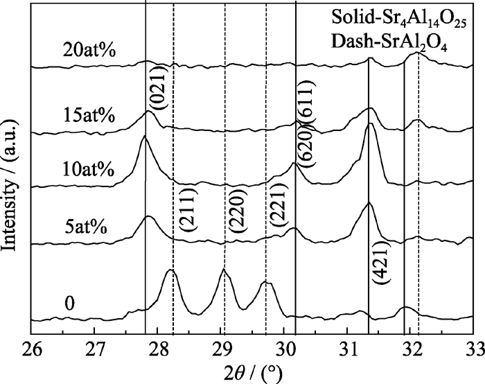 H3BO3was added as flux agent to reduce the solid state reaction temperature of REDAs. However, it is also found that boron has effects on the luminescence properties of the REDAs[ 13]. In this section, a set of five samples were prepared at 1400℃ with different amounts of H3BO3addition. The amounts of H3BO3addition for the five samples are 0, 5at%, 10at%, 15at%, and 20at%, respectively. Figure 1 shows the XRD patterns of the five samples. The addition of H3BO3has great effect on the crystalline structure of the solid reaction products. For the sample without H3BO3, no peak corresponding to Sr4Al14O25 phase is observed, and the product is mainly SrAl2O4 (2 θ=28.387º for (211), 2 θ=29.276º for (220), and 2 θ=29.923º for (211), JSPDS 34-379). As the amount of H3BO3 increases, peak intensities corresponding to Sr4Al14O25 increases (2 θ=27.824º for (021), 2 θ=30.201º for (620) and (611), and 2 θ=31.408º for (421), JSPDS74-1810), and peak intensities corresponding to SrAl2O4 phase diminishes. Peak at 2 θ=31.9º is also from SrAl2O4, and peak at 2 θ=32.1º is from Sr4Al14O25, as listed in JSPDS 34-379 and JSPDS74-1810, but no specific crystalline faces were denoted to them. For samples with H3BO3 amount more than 10at%, peak intensities corresponding to Sr4Al14O25 phase decreases, which is in agreement with the results found by Haranath, et al for CaAl2O4:Eu2+, Nd3+ phosphor[ 11].