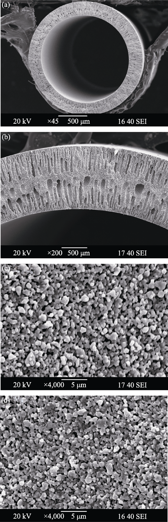 Fig. 1 SEM images of the YSZ hollow fiber a and b cross-section, c surface at the lumen side, d surface at the shell side