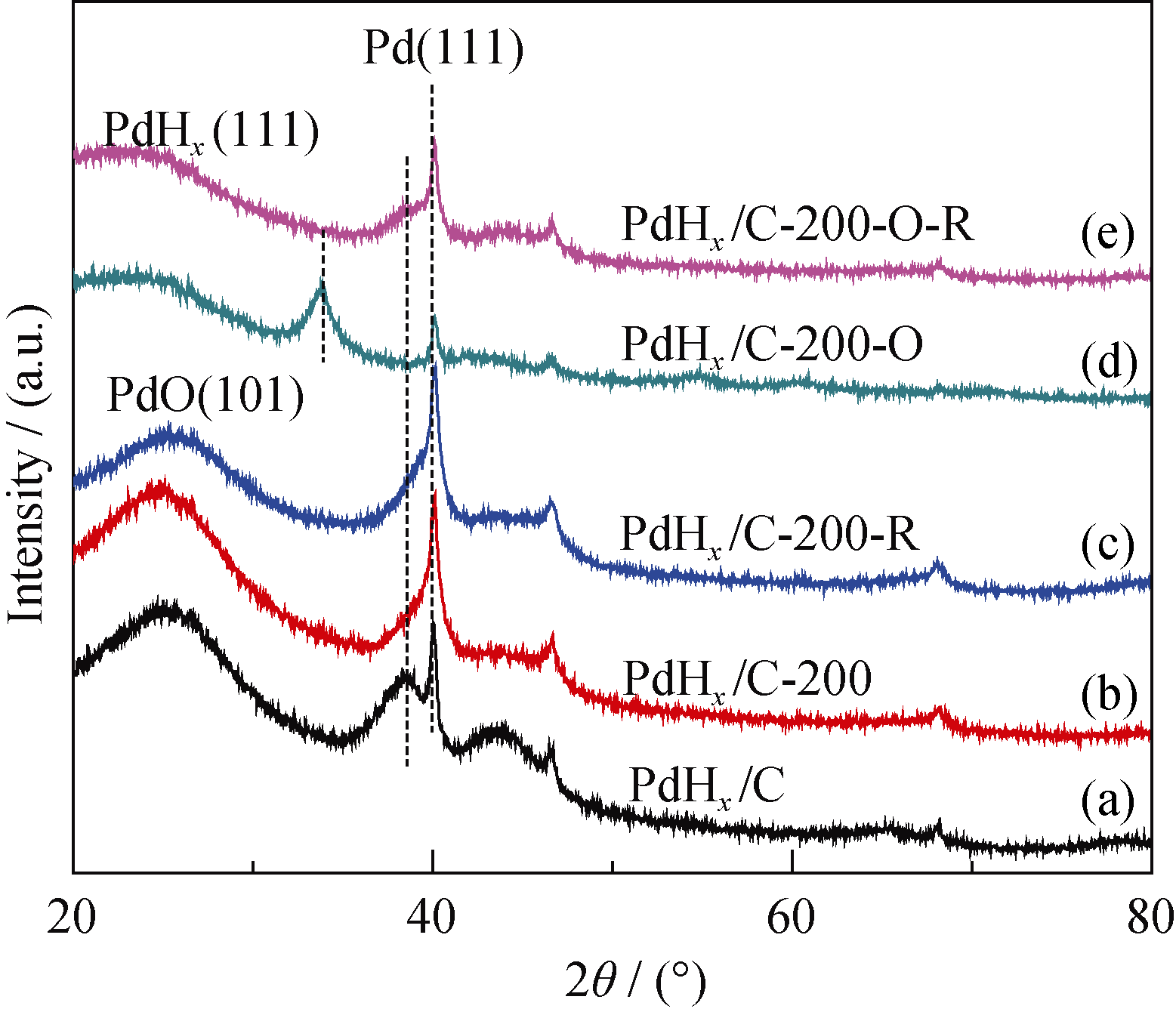 图4分别为PdH x-Pd/C、PdH x-Pd/C-200、PdH x-Pd/C-200-R、PdH x-Pd/C-200-O和PdH x-Pd/C- 200-O-R的XRD图谱, 比较曲线a和b, 可以看出PdH x-Pd/C在N2气氛中经200℃处理后, 表征PdH x的特征峰基本消失(如图4b所示), Pd晶粒尺寸(111)由19.0 nm减小到6.2 nm。根据PdH x(α-PdH x, β-PdH x)的热稳定性, 不难理解, 这是因为在该条件下PdH x发生了PdH x→Pd+H2的分解反应[ 28]。在(111)晶面尺寸为3.9 nm的PdH x分解生成Pd的同时, 也降低了Pd的平均粒径[ 29]。