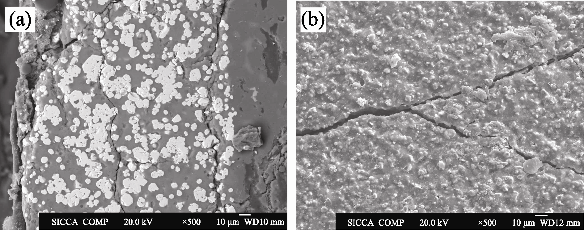 Figure 1 shows the microstructure of pre-coating after pyrolyzed at 1000℃. The pre-coating shows a high integrity without obvious cracks despite of the high volume shrinkage associated with phenolic resin decomposition and the release of gas byproducts during the pyrolysis process. Generally, the microstructure of the pre-coating is relatively loose with many pores. Such a microstructure is beneficial for further liquid silicon infiltration and gaseous silicon diffusion. It only can be seen diffraction peaks of ZrB2 phase from XRD pattern of the pre-coating, which indicates that the carbon derived from the pyrolysis of phenolic resin is in an amorphous state (Fig. 2(a)).
