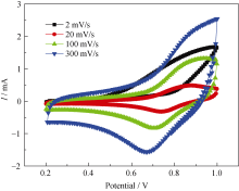 图4为以Ti/TiO2纳米阵列为电极的模拟超级电容器的循环伏安曲线。从图4可以明显地看到, CV曲线形状偏离矩形特征, 这是因为TiO2纳米管阵列电极和碳材料电极不同, 碳材料电极主要表现为双电层电容, 而TiO2比表面积比碳材料要低, 且发生一定的氧化还原反应[ 23], 因此, TiO2纳米管电极的循环伏安曲线形状偏离矩形。从图4还可以发现, 随着扫描速率的增大, 循环伏安的阳极响应电流增大明显, 因为采用的是水系电解液, 因此扫描速率增大, 析氧电流增大, 析氧趋势增大。从图4还可以明显看到, CV图上存在一对氧化还原峰, 根据文献报道[ 24]并结合XRD测试结果, 此氧化还原峰对为TiO2和Ti2O3之间的氧化还原反应: