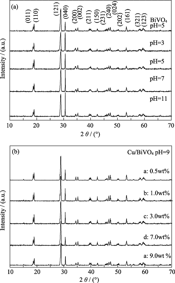 图1(a)是Cu掺杂量为5.0wt%时, 不同pH值下所得水热产品的的XRD图谱。图1(a)显示, 所有样品在(011)、(110)、(121)、(040)、(200)、(002)、(211)、(150)、(231)、(240)、(024)、(202)、(161)、(321)和(123)晶面处出现了较强的衍射峰, 与BiVO4的标准卡(JCPDS 14-0668)十分吻合, 属于单斜晶系的I2/b空间群, 没有发现任何不纯物相的存在, 说明样品纯度较好。对比BiVO4谱, Cu-BiVO4主峰位置(121)由28.75°稍微移向了较高衍射角位置(28.98°), 说明Cu-BiVO4晶面距略小于纯BiVO4 的晶面距。晶面距减小的主要原因是Cu2+的半径(0.073 nm)小于Bi3+半径(0.096 nm), 当它取代Bi3+进入BiVO4 晶格而使BiVO4 的晶胞参数变小(见表1)。随着溶液pH值的增大, BiVO4的XRD衍射峰的位置并没有变化, 强度相差也不大, 这说明超声-水热法制备的样品的物相结构和结晶程度不受pH的影响。