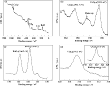 | 图2 Cu/BiVO4(5.0wt%)的XPS图谱Fig. 2 X-ray photoelectron spectroscopy (XPS) spectra of Cu/BiVO4(5.0wt%)(a) survey spectrum; (e) Cu2p; (b) Bi4f; (c) V2p (inset: O1s) |