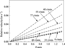 为便于观察, 在晶体上选取OA线(见图1)作为分析线。图6为在不同转速下, OA线上的晶体与溶液相对速度在X轴上的投影。可见, 在不同的转速下, 晶体与溶液相对速度的变化趋势一致, 且相对速度的大小与到中心点的距离成线性关系。随着转速的加快, 相对速度增大, 相对速度的增幅也愈来愈大, 晶体表面的生长边界层厚度随之减小, 相应的晶体的生长速度也会加快[ 13, 18]。