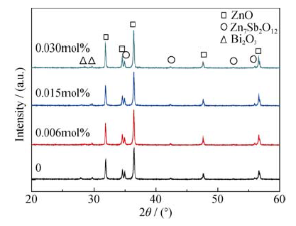 采用X射线衍射 (XRD; d8advance 3.0) 分析试样的晶相结构; 采用扫描电子显微镜 (SEM; VE-9800S) 观察试样的表面形貌。试样的压敏电压E定义为: U1mA/d, 式中U1mA是电流为1mA时的电压, d是试样的厚度(mm)。非线性系数定义为: