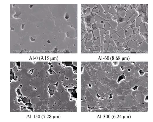 Al掺杂ZnO压敏陶瓷试样的显微形貌如图2所示, 图注括号内的数值为试样的平均晶粒尺寸, 平均晶粒尺寸是通过统计每个试样上100到200个晶粒的大小计算得到的。随着Al掺杂量的增加, ZnO试样的平均晶粒尺寸从9.15 μm下降到6.24 μm, 晶间相增加。结果表明, 即使很少量的Al元素掺杂就能够有效地抑制ZnO晶粒的生长。