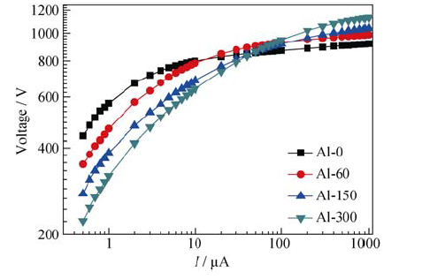 对ZnO压敏陶瓷的研究表明, 当Al掺杂量很高(>0.1mol%)时, 陶瓷内部会形成ZnAl2O4尖晶石相并阻碍ZnO晶粒的生长[8]。这种抑制是由于阻塞效应引起的晶界运动性的降低。但XRD图谱显示, 微量Al掺杂试样中并没有检测到ZnAl2O4, 这说明Al元素是以其他方式影响了ZnO晶粒的生长, Al离子有可能进入ZnO晶粒中改变了其缺陷结构, 从而影响ZnO晶粒的生长。图3为不同Al掺杂量ZnO压敏陶瓷试样室温下的I-V特性, 试样的非线性系数和压敏电压见表2, 从表中可以看到, 未掺Al试样I-V曲线击穿区域更加平坦, 试样的非线性系数α是41.98。而Al掺杂量为0.030mol%时, 试样的非线性系数下降到14.26。随着Al掺杂量的增加, 试样的压敏电压E逐渐从235 V/mm提高到292 V/mm。