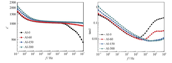 图4 不同Al掺杂量ZnO压敏陶瓷试样的室温(25℃)介电谱