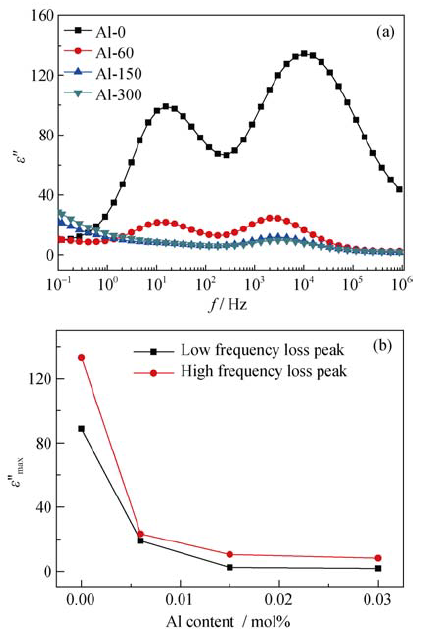 ZnO压敏陶瓷的缺陷结构对于其电性能具有重要作用, 而ZnO压敏陶瓷的缺陷结构与其极化过程紧密相关。而介电谱常用来探测缺陷电荷的松弛运动。因此, 采用介电谱能够有效地研究ZnO压敏陶瓷的缺陷结构[15]。对ZnO压敏陶瓷低温介电谱(-100℃)的研究发现, ZnO压敏陶瓷存在两个活化能分别为0.32eV和0.23eV的损耗峰, 它们分别是由氧空位和锌填隙缺陷的电子松弛过程引起[16-17]。在ZnO压敏陶瓷模量谱上能够观察到相同的松弛过程, 进一步验证了前述结果的正确性[18-19]。总而言之, 通过损耗峰随配方和制备工艺的变化可以检测ZnO压敏陶瓷缺陷结构的改变。因此可以通过低温介电谱直观地表征Al掺杂对ZnO压敏陶瓷缺陷结构的影响, 进而分析本征缺陷变化对ZnO压敏陶瓷显微结构和电性能的影响。