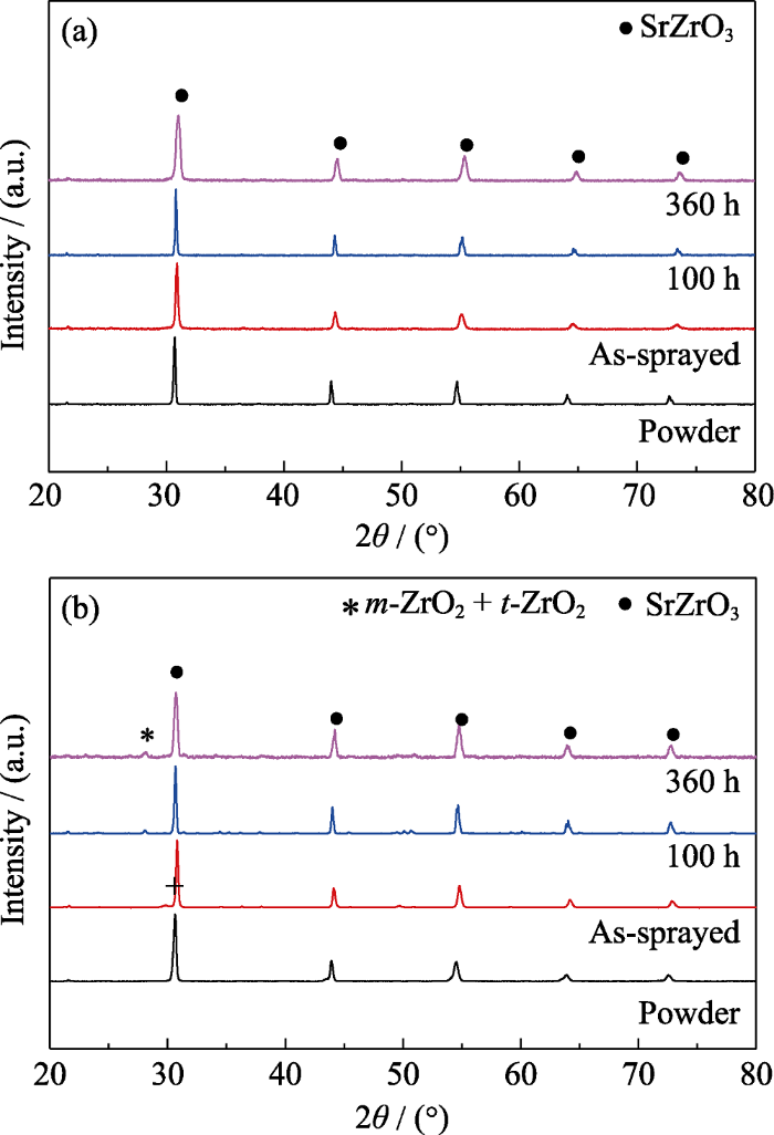 SrZrO3以其高熔点、低热导率和较高的热膨胀系数而成为热障涂层候选材料之一。SrZrO3热障涂层在室温到使用温度范围之间存在相变, 随着温度升高存在从正交结构向假四方结构, 四方结构和立方结构的相变[10]。马文等[11,12,13]研究了单一稀土氧化物和双稀土氧化物掺杂改性的SrZrO3块材, 发现通过稀土掺杂能够抑制SrZrO3相变, 并降低其热导率。但是由于SrO的饱和蒸气压相对较大, 在大气等离子喷涂过程中, SrO的挥发量大于ZrO2的挥发量, 造成涂层组分偏离SrZrO3化学计量比, 从而使得制备态涂层中出现第二相ZrO2[11]。通常具有符合化学计量比的涂层具有较高的热稳定性[14]。针对等