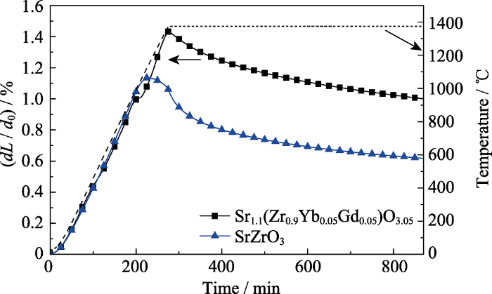 图4为涂层抗烧结曲线, 可以看出, SrZrO3烧结曲线最先出现拐点(1146.47℃), 然后是Sr1.1(Zr0.9Yb0.05Gd0.05)O3.05(1371.62 ℃), 出现拐点表明涂层的热膨胀速度小于涂层的热烧结收缩速度, 导致涂层的长度缩短, 在烧结曲线上就表现为烧结曲线斜率为负, 曲线呈下降趋势。Sr1.1(Zr0.9Yb0.05Gd0.05)O3.05涂层的烧结系数为7.27× 10-6 s-1, 小于SrZrO3的8.09×10-6 s-1。 涂层掺杂的稀土元素Yb和Gd会对于晶格中其他扩散原子的迁移产生阻滞作用, 从而影响烧结反应的进行, 提高涂层的抗烧结性能[18]。