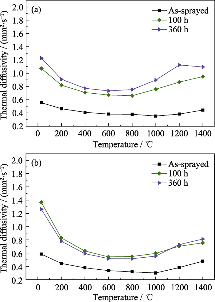 图5是涂层的热扩散系数曲线。制备态涂层的热扩散系数曲线相差不大, 随着热处理时间的延长, 涂层烧结致密化, 涂层中的层状结构消失, 气孔减少, 涂层的热扩散系数增大。涂层热处理360 h后, SrZrO3和Sr1.1(Zr0.9Yb0.05Gd0.05)O3.05涂层的热扩散系数在1000 ℃分别为0.56和0.89 mm2∙s-1。涂层的热扩散系数在800 ℃左右开始呈现上升趋势, 这主要与陶瓷材料在高温下的半透明特性有关。高温条件下, 陶瓷材料对热辐射在一定程度上是半透明的, 光子导热的贡献增大, 导致涂层的热扩散系数增大。