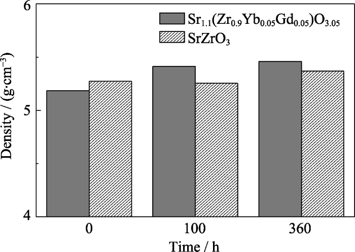 图6是涂层的密度图。随着热处理时间的延长, 涂层发生烧结致密化, 导致涂层密度上升。热处理360 h后SrZrO3和Sr1.1(Zr0.9Yb0.05Gd0.05)O3.05涂层的密度分别达到理论密度的99%和95%。
