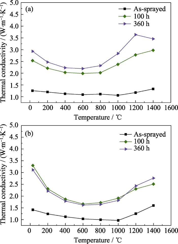 图7是涂层的热导率曲线。涂层的热导率变化规律与热扩散系数一致。随着热处理时间的延长, SrZrO3涂层热导率先增加后减小, 一方面由于涂层在热处理过程中发生烧结, 层状结构消失, 气孔率下降, 导致涂层的热导率逐渐增加; 另一方面, 涂层中的第二相由制备态的t-ZrO2逐渐转变为m-ZrO2, 而m-ZrO2的热导率比t-ZrO2高28%~ 91%[19], 从而导致涂层在热处理前期(0~100 h)的热导率升高。Sr1.1(Zr0.9Yb0.05Gd0.05)O3.05涂层的热导率随着热处 理时间的延长逐渐增大。热处理360 h后, SrZrO3和Sr1.1(Zr0.9Yb0.05Gd0.05)O3.05涂层的热导率分别为1.82 W/(m∙K) (1000 ℃)和2.83 W/(m∙K) (1000 ℃)。