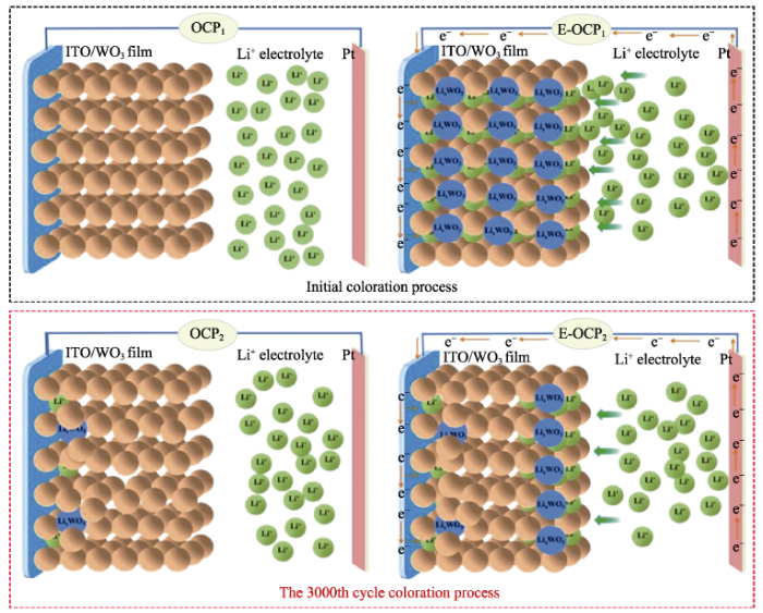 WO3电致变色薄膜具有大光学调制范围、高着色效率、良好的可逆性等诸多优点, 相比于有机电致变色材料, WO3薄膜还能在多次循环过程中保持稳定、可逆的颜色变化, 以及在恶劣的环境中持续地工作。然而, 在长时间的电荷插入和抽出的过程中, WO3薄膜和器件的EC性能会大幅度下降, 如光调制能力减弱、响应时间变长等, 严重影响了电致变色器件的实际使用效果。