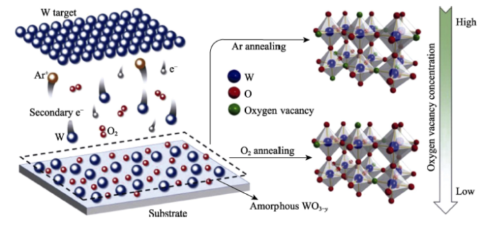 常用的WO3薄膜生产方法有水热法[13]、溶剂热法[14]、溶胶-凝胶法[15]、电化学沉积法[16]、喷墨打印[17]和磁控溅射法[18]等。由于WO3薄膜的制备方法多样, 每种方法的可调参数较多, 所以在不同工艺下制备的WO3薄膜质量差异很大。水热法是一种高温高压控制晶体生长的方法, 但需要先在基底上制备晶种层, 电子科技大学贾春阳等[13]研究了一种简单高效制备WO3薄膜的一步水热法, 使用甘油作为自种剂, 无需预先制备晶种层, 制备出的WO3薄膜具有15000次的高循环稳定性和78.1%的大光学调制幅度, 着褪色时间较短(5 s/6 s)。河南大学蔡国发等[16]采用了一种新颖的脉冲电化学沉积法制备高性能的多孔WO3薄膜, 这种方法无需模板和热处理, 适用于不同的导电基底, 其中在ITO玻璃上制备的WO3薄膜具有97.7%超大光学调制幅度和118.3 cm2/C高着色效率。磁控溅射法是一种常用的物理制备方法, 北京航空航天大学刁训刚课题组[18]采用磁控溅射法研究了WO3薄膜在Ar和O2气氛中退火后的性质, 如图2所示, 发现在Ar气中氧空位浓度高, WO3薄膜的EC性能更好, 但循环稳定性变差。