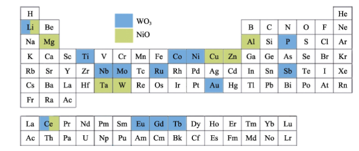 Elements doped to WO3 and NiO films which researched from 2016 to 2020