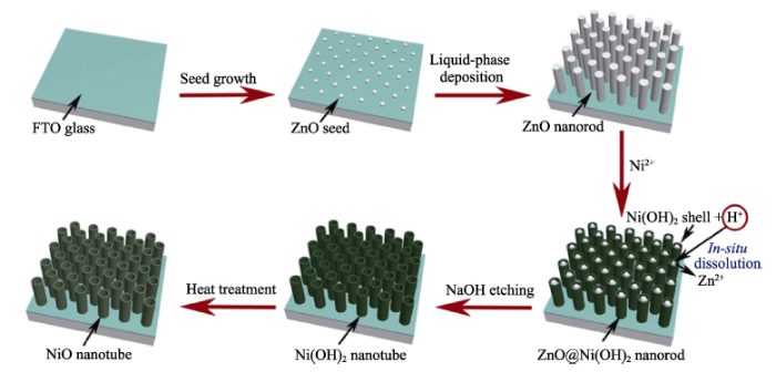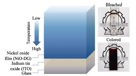 氧化镍在褪色时为透明态或浅褐色, 着色时呈现深棕色, 这种柔和的中性色可与WO3的颜色叠加, 非常适合用于智能窗中。但是NiO的光学调制率通常不如WO3, 还存在漂白态的透过率较低、着褪色响应时间长、长期循环稳定性差等问题。本节从薄膜的生产方法改进、元素掺杂、纳米结构的设计和复合材料的引入等方面介绍NiO电致变色性能优化的研究进展。