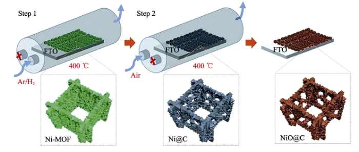 NiO薄膜的低导电性导致了开关速度慢、着色效率低的问题, 利用复合材料的协同作用可以改善NiO薄膜的电致变色性能。中国科学院长春光学精密机械与物理研究所刘星元团队[60]采用简单的一步电子束沉积法, 在室温条件下成功地制备了透明、导电、无需ITO的NiO/Ag/NiO膜, 该薄膜在可见光区平均透过率超过70%。东华大学王宏志课题组[61]通过金属有机骨架(MOF)的两步热解法制备了分级多孔NiO@C薄膜, 制备流程见图7, 调节C的含量可改善薄膜的电化学和EC性能, 最佳C含量的多孔NiO@C薄膜具有极快的切换速度(tc= 0.46 s, tb=0.25 s)、超高的着色效率(113.5 cm2/C)和显著的循环稳定性20000次)。