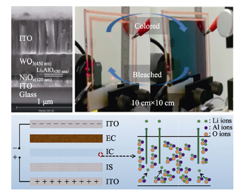 固态电解质具有良好的稳定性和耐候性, 便于封装和大规模制备, 在全固态电致变色器件中具有极其重要的地位, 如Ta2O5[71]、ZrO2[72]、LiF[73]、LiPON[74]等。锂基固态电解质的研究较为成熟, 李垚课题组[73]采用电阻蒸发法制备了LiF无机固态电解质, 在无机全固态glass/ITO/WO3/LiF/NiO/ITO器件中表现出良好的性能。中国科学院上海硅酸盐研究所包山虎团队[75]通过锂铝靶共溅射制备出的LixAlOz薄膜具有高透明度、良好的离子导电性和超高稳定性, 该团队还制备了10 cm×10 cm的大型全固态电致变色器件(ITO/NiOx/LixAlOz/WO3/ITO), 如图8所示。固态电解质在应用和制备上具有独特的便捷性, 但是离子电导率低的问题仍是当前固态电解质的研究重点。