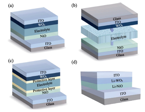 传统的电致变色器件为五层结构, WO3和NiO通常作为电致变色层和离子存储层, 二者中间是离子传导层, 两侧是用于传输电子的透明导电层。电致变色器件的整体性能不仅与各层薄膜的性质有关, 还取决于层与层之间的协同作用和器件结构的设计。