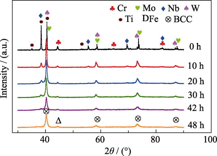 图1为Cr0.5MoNbWTi混合粉体经不同时间球磨后的XRD图谱。从图中可以看出, 当未经球磨时, 混合粉体的所有金属元素对应的衍射峰均清晰可见。随着球磨时间的延长, 各金属元素的衍射峰逐渐减弱甚至消失。球磨48 h后, 除了检测到球磨过程中罐体不断剥落的少量Fe元素外, 其他元素均形成了BCC结构的单相固溶体。根据XRD结果计算出该合金化粉体的平均晶粒尺寸为28.3 nm, 表明球磨获得了细小的粉体, 这有利于后续的烧结致密化。另外, 对球磨前后粉体的非金属元素C、N、O含量进行定量分析, 如表1所示。从表中可以看出, 球磨的粉体中C、N、O元素含量均明显增加。虽然球磨引入了大量非金属元素, 但在球磨后粉体中并未检测到碳化物、氮化物或氧化物的衍射峰, 说明非金属元素可能溶于固溶体中而并非形成相应的化合物。
