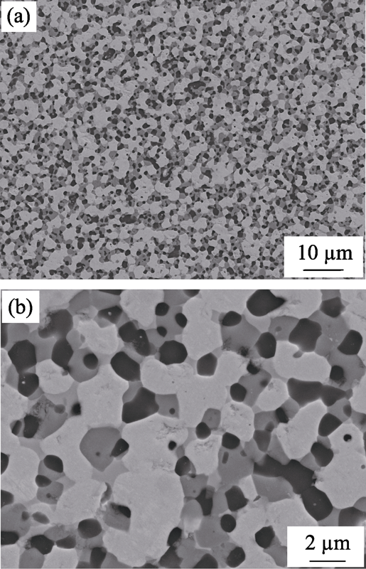 图2为经1450 ℃烧结的陶瓷颗粒增强高熵合金复合材料的微观组织照片。从图2可以看出, 烧结体内部没有产生宏观或微观的空洞和微裂纹, 说明该材料致密化程度较高, 根据阿基米德排水法测定该材料的密度为9.374 g/cm3, 相对致密度为98.3%。烧结块体的微观组织呈现出三种不同的物相, 分别为浅灰、深灰和黑色物相, 其体积分数分别为50.0%, 31.5%和18.5%。三种物相晶粒尺寸均匀细小且相互之间弥散分布。从烧结体的XRD图谱(图3)中可以看出, 放电等离子烧结后, 除原生相BCC(Im-3m, 229)外, 产生了两个新生相, 分别具有面心立方结构(Fm-3m, 225)和A2B3的六方结构(R-3C, 167)。采用EPMA对三种物相进行元素的定性面分析及定量点分析, 其中图4(a)为烧结体的背散射电子(BSE)图像, 图4(b~i)分别为各元素的面分布, 表2为定量点分析结果。三种物相之中, 浅灰相主要富集W(37.15%)、Mo(34.17%)、Cr(15.25%)和Nb(8.21%), 结合XRD推断浅灰相为BCC固溶体; 深灰相主要富集Nb(31.73%)和N(33.52%)元素, 并含有一定量的Ti(18.37%)和C(9.95%)元素。考虑到NbN和TiN 陶瓷相在室温下均呈FCC(Face Centered Cubic)结构, 且根据原子百分比计算得到(Nb,Ti) : (N,C)≈1 : 1, 由此推断深灰相是具有FCC结构的(Nb,Ti)(N,C)陶瓷固溶体相; 黑色相主要含O(59.66%)和Ti(35.14%), Ti : O的原子比约为2 : 3, 与XRD图谱中的A2B3物相相对应。总之, 掺杂非金属元素的过饱和BCC预合金化粉体经放电等离子烧结后, 除了原生相BCC外, 在基体内部形成了大量的(Nb,Ti)(N,C)和Ti2O3弥散分布的难熔陶瓷相。这主要得益于参与反应的非金属元素先均匀地固溶于合金化粉体之中, 使得反应合成的陶瓷颗粒能够均匀弥散地分布在复合材料内部。另外, (Nb,Ti)(N,C)和Ti2O3陶瓷相具有不同的晶体结构, 可以较好地阻碍晶粒长大, 陶瓷相的平均晶粒尺寸为0.85 μm左右。
