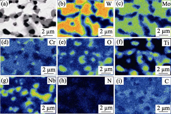 陶瓷增强难熔高熵合金复合材料的BESEM照片(a)及其面扫描元素分布(b-i)