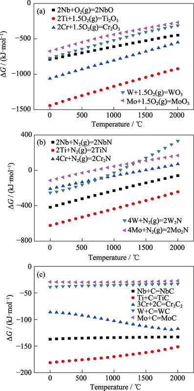 表2给出了BCC固溶体内非金属元素的含量, 可以看出, 烧结后仅有少量的C继续固溶于BCC内, 而O和N与其他金属元素反应生成了对应的陶瓷相, 这是由非金属与金属元素的电负性差异及混合焓决定的。表3给出了三种非金属元素与金属元素的电负性差异和混合焓, 可以看出, 与C元素相比, N和O与各金属元素之间具有更大的电负性差异以及更负的混合焓, 更容易形成化合物而并非固溶于BCC。HSC Chemistry 6.0软件的Database数据库中各组元的热力学参数, 利用软件中化学反应方程热力学计算模块, 可计算得到非金属元素与金属元素反应的Gibbs自由能变化趋势, 如图5所示。在实际情况下, O和N不以气体单质状态存在, 而且缺乏O和N在间隙固溶条件下的热力学参数, 因此本文借助O2和N2的热力学参数进行计算, 用来对比同一非金属与各难熔金属元素发生反应的热力学倾向。从图5(a)中可以看出, O与各元素发生反应的Gibbs自由能均为负, 即在热力学角度上均有可能发生化学反应。其中Ti与O发生反应生成Ti2O3的自由能最负, 因此在氧含量有限的条件下, O元素会优先与Ti元素反应形成Ti的氧化物。另外, 图5(b, c)结果显示N和C分别与Ti和Nb的反应倾向较大。而相应的反应产物TiN、NbN、TiC和NbC均具有FCC结构, 而且Ti与Nb的电负性、原子半径比较接近; C和N的原子半径十分接近, 因此在化合物形成过程中, 直接形成了(Nb,Ti)(N,C)难熔陶瓷固溶体。